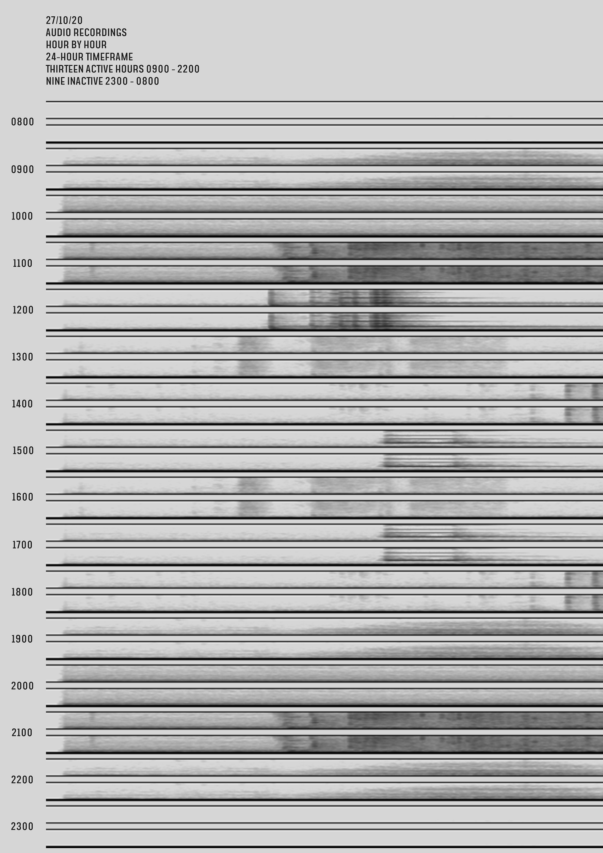 Static and moving infographic containing a spectrogram timeline of my recorded activities during the 27th of October, 2020.